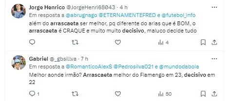 “Arrascaeta também. Ele tem uma magia. Estou com o Eric. Se fizer um top-5 de jogadores que mudam o jogo no Brasil, o Arias está facilmente na lista, mas o Arrascaeta, que também está nesta lista, tem uma mágica diferente”, afirmou Ana Thaís Matos.