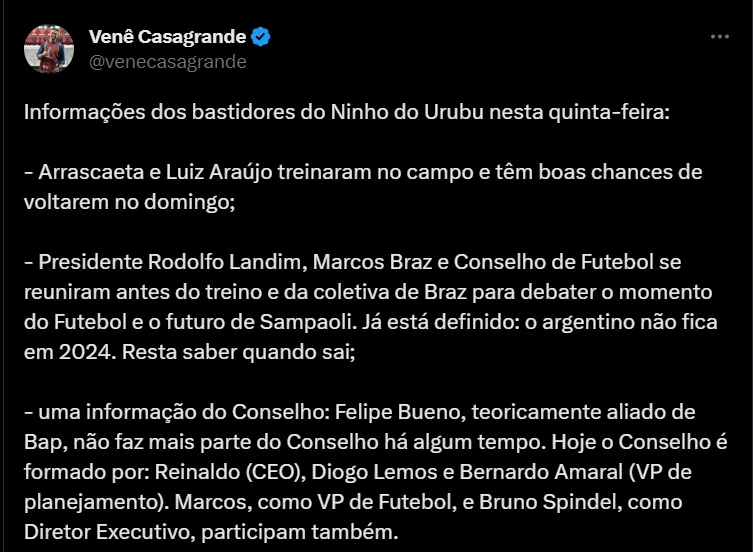 “Presidente Rodolfo Landim, Marcos Braz e Conselho de Futebol se reuniram antes do treino e da coletiva de Braz para debater o momento do Futebol e o futuro de Sampaoli. Já está definido: o argentino não fica em 2024. Resta saber quando sai” — revelou Venê.