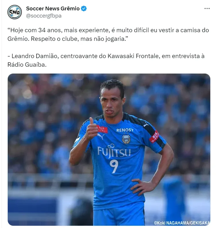 Em entrevista à rádio Guaíba, Leandro Damião abriu o jogo e disse que nunca jogaria no Grêmio, grande rival do Internacional. Ele afirma respeitar, mas nega qualquer chance de vestir as três cores gremistas.