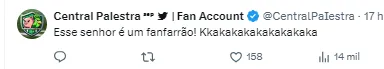 “Ele fala tanto em inteligência artificial. Ele deveria dar menos valor à inteligência artificial e mais à inteligência emocional, que ele não tem absolutamente nenhuma. Então agora quem tem que tomar as providências são as autoridades. A parte do Palmeiras, nós já fizemos”, disse.