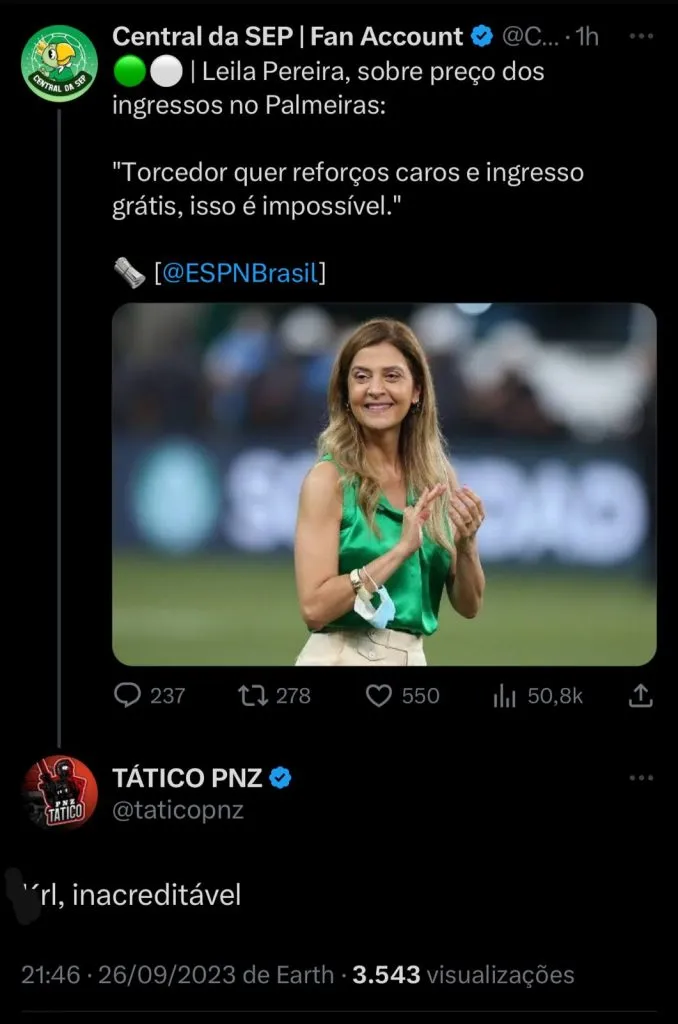 “O torcedor quer reforços caros e ingresso grátis, isso é impossível” afirmou Leila Pereira, presidente do Palmeiras.