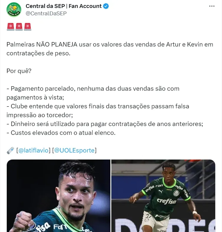 Um dos motivos do Palmeiras ter decidido não usar o dinheiro das vendas dos jogadores em busca de novas contratações se dá pelo fato do negócio ser parcelado, tanto na venda de Artur quanto de Kevin.