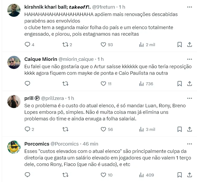 Na web, a decisão da diretoria não caiu nada bem para a torcida do Verdão, que espera, ainda, por grandes reforços para o ano de 2024, ainda mais depois do título brasileiro.