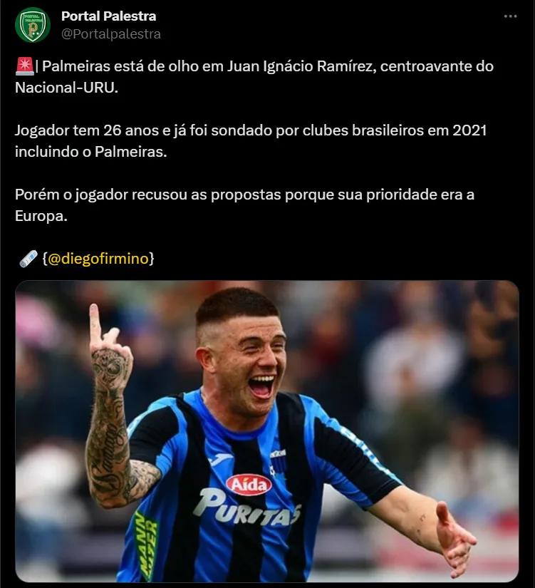 Por isso, um camisa 9 está no radar do verdão. De acordo com as informações publicadas pelo jornalista Diego Firmino, o Palmeiras tem interesse na contratação do atacante Juan Ignácio Ramírez, do Nacional, do Uruguai.