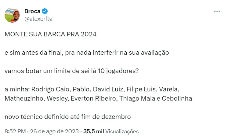 Nas redes sociais, a torcida do Flamengo está demonstrando impaciência com os jogadores atuais do elenco sob o comando de Sampaoli, e elaborou uma lista dos jogadores que desejam ver deixando o clube ao final da temporada. Os nomes mencionados incluem: Rodrigo Caio, Pablo, David Luiz, Filipe Luís, Varela, Matheuzinho, Wesley, Everton Ribeiro, Thiago Maia e Cebolinha.