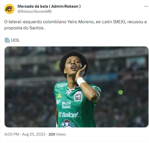 Apesar de já ter sido rejeitado anteriormente por Paulo Turra, o lateral Yairo Moreno foi alvo de uma oferta formal por parte do Santos.