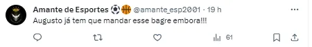 Para o jogo desta terça-feira o jogador será desfalque devido dores no músculo posterior da coxa esquerda, o que fez muitos torcedores se manifestarem nas redes sociais. Alguns comentaram que irão sentir falta do jogador, mas a maioria detonou o camisa 10 fazendo comparação com Luan, ex-atleta da equipe.