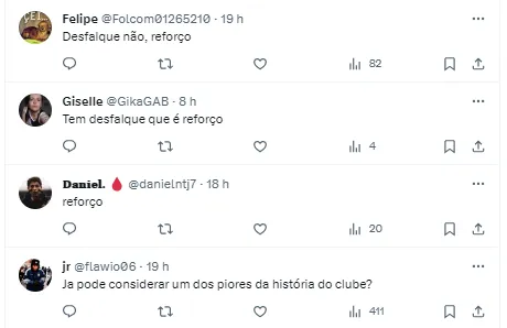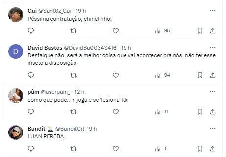 “O famoso migué, péssima contratação do Corinthians, enganados de novo” , “Esse pode entrar pra lista da dispensa em 2024, não serve pra nada (…)” , “Que diferença esse p* faz no time?” , “Reforço” , “Primeira oportunidade tem que vender. Que cara horrível” , “Mal posso esperar ele estrear no time, com certeza vai ajudar muito no meio” , “Luan deixou um substituto a altura” , “Tem desfalque que é reforço” , “Devolve essa porcaria”, “Gosto, f*’, escreveram.