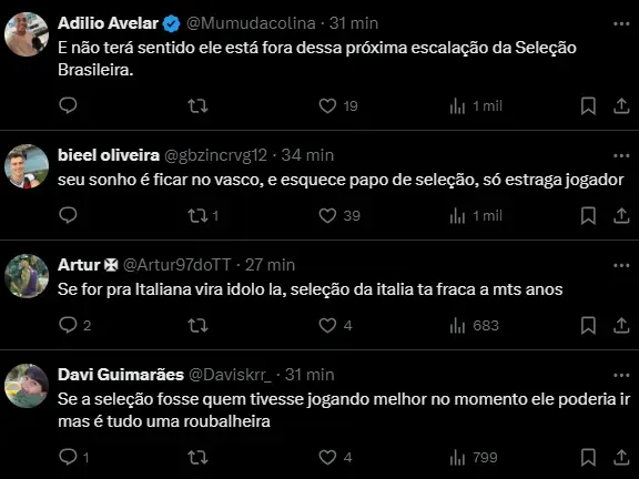 “Continuo focado para o Vasco porque, se estiver bem aqui, vai ser melhor para ter essa oportunidade. Vou continuar fazendo o meu trabalho”, acrescentou o atleta do Gigante da Colina.