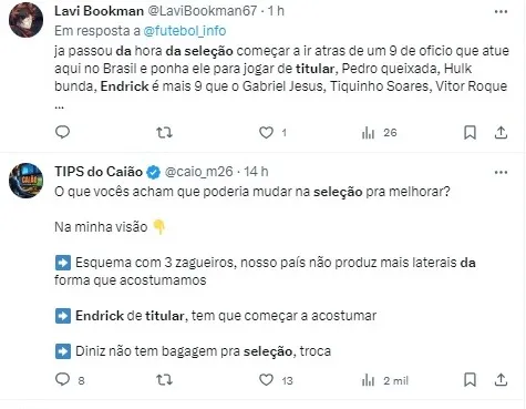 “O 9 da Seleção Brasileira, hoje, tá difícil. Como a gente não encontrou o titular da posição, eu vou nas apostas. Eu apostaria no Endrick. Bota lá, ‘vamo’ ver. De repente, a gente acha o 9. Infelizmente, a gente não encontrou um titular para a posição”, completou.