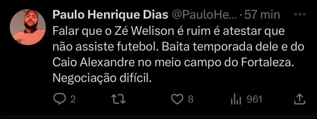 Segundo informações do jornalista Gabriel Sá, o São Paulo tem em sua lista de nomes para contratar, o volante Zé Welison, do Fortaleza.