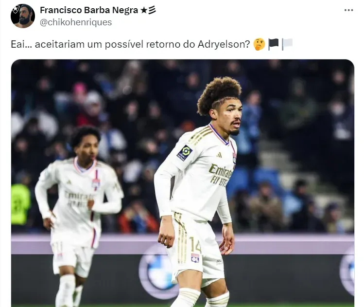 A tendência é que Adryelson siga no futebol europeu, defendendo as cores do Lyon. Por ora, ele está sem espaço, mas o entendimento é que o brasileiro está no período de adaptação.