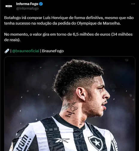 De acordo com as informações publicadas pelo jornalista Braune, o Botafogo vai adquirir o atacante Luís Henrique de forma definitiva junto ao Olympique de Marselha.