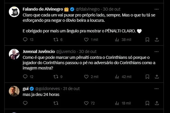 “Mas o problema hoje é o VAR mostrar o lance do jeito que quer e não mostrar a jogada toda. O jogador do Corinthians estava com o pé no chão e o VAR não mostrou. Mais culpado do que o Daronco é o VAR”, acrescentou o cartola.