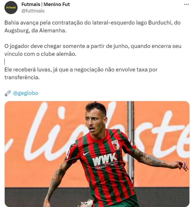Iago é um lateral-esquerdo de 26 anos de idade que defende as cores do Augsburg, da Alemanha, clube que ele tem contrato até junho deste ano. O Bahia está fechando a contratação do defensor sem custo, exatamente pelo fato do mesmo estar em fim de contrato.