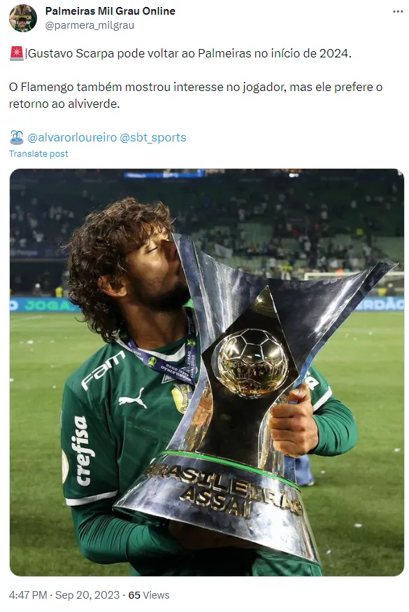 Entretanto, o nome de Gustavo Scarpa tem ganhado força no futebol brasileiro, e um possível retorno do atleta de 29 anos ao Brasil pode se tornar realidade. De acordo com o jornalista Álvaro Loureiro do SBT Sports, o Palmeiras pode trazer o jogador de volta no início de 2024, lembrando que seu contrato atual com a equipe grega vai até julho do próximo ano.