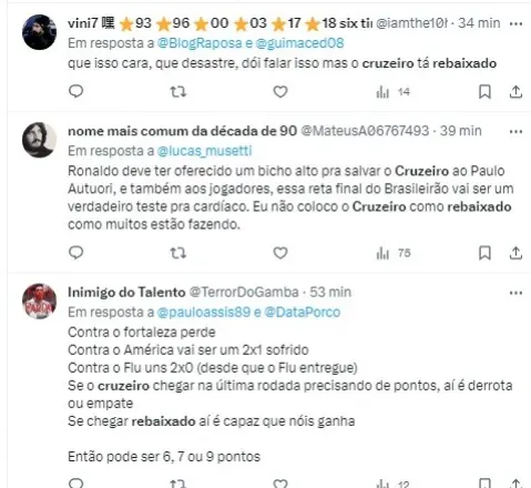 “Pela qualidade de jogo que o Vasco está apresentando, acredito que o Vasco vai conseguir escapar. Essa última vaga vai ficar entre Bahia e Cruzeiro. O Coritiba já foi, o Goiás também está em situação muito difícil, acho que não escapa. Para mim, a última vaga fica entre Bahia e Cruzeiro”, concluiu o debatedor.