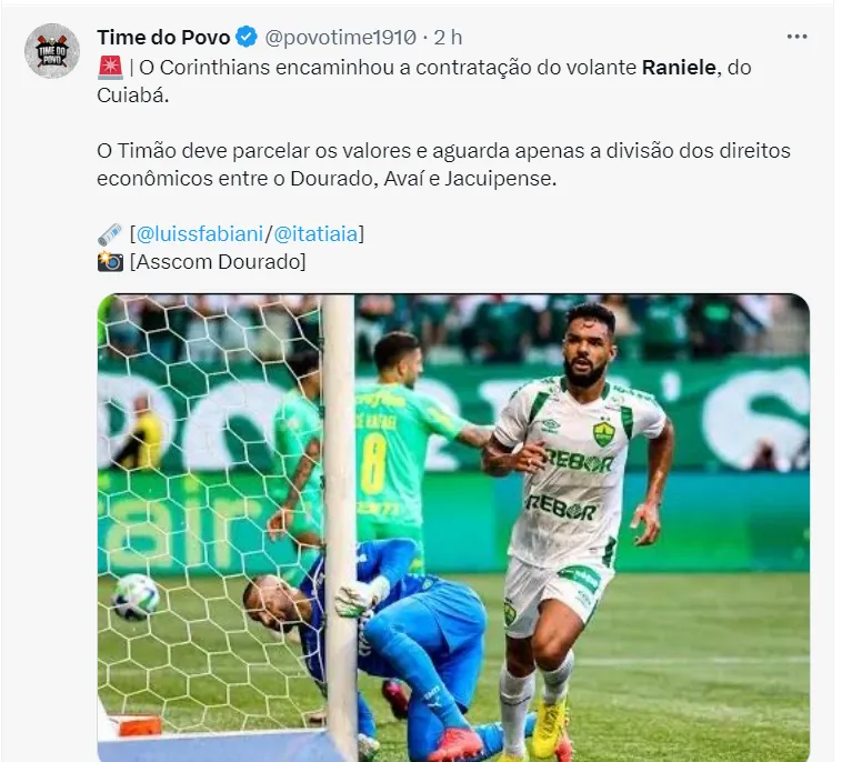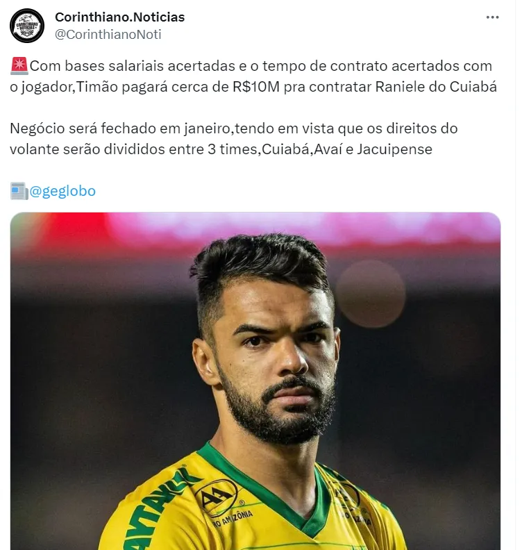 Para deixar o time de Mano Menezes ainda mais forte, o Corinthians acertou as bases salariais com Raniele, do Cuiabá, grande destaque do Brasileirão deste ano. O jogador custará cerca de R$ 10 milhões aos cofres do clube paulista.