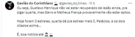 Sobre Matheus França, o presidente comentou que está próximo do acerto. De acordo com ele, o Corinthians quer deixar pré-definido o valor de compra do jogador antes de fechar a contratação e espera uma resposta do Flamengo.