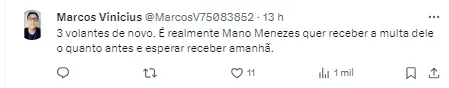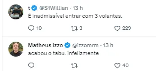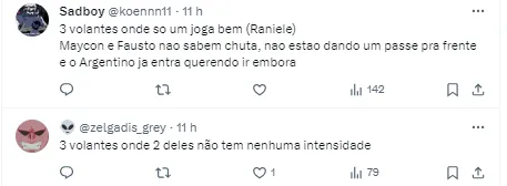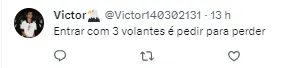 “É inadmissível entrar com 3 volantes”, “Acabou o tabu. Infelizmente”, “O Mano realmente vai insistir nessa escalação? Ficou claro que não deu certo no jogo passado”, “3 volantes de novo. É, realmente Mano Menezes quer receber a multa dele o quanto antes e esperar receber amanhã”, “3 volantes de novo?”, “3 volantes onde 2 deles não tem nenhuma intensidade”, “3 volantes? Em casa? Perdemos”, escreveram alguns torcedores no Twitter (confira mais abaixo).