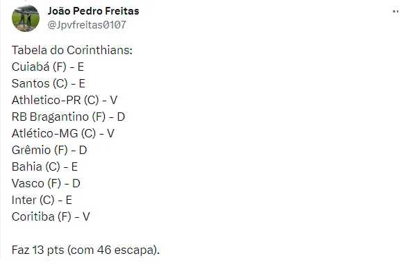 Na 15ª colocação do Campeonato Brasileiro, o time, que agora é comandado por Mano Menezes, vem correndo risco de rebaixamento, já que está apenas três pontos à frente do Vasco, que está na 17ª posição com 30 pontos.