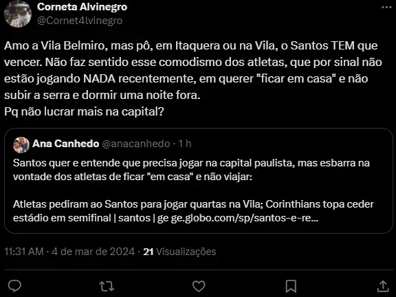 É um pedido exclusivo dos atletas de ficarem na Baixada Santista nesta fase do mata-mata da competição regional e o presidente Marcelo Teixeira está sabendo junto com o departamento de futebol.