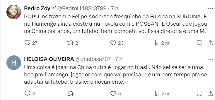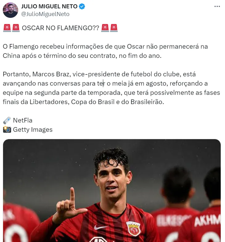 Oscar pode ser um novo reforço. Ele está de saída da China e o Flamengo trabalha para fechar um acordo já para agosto. A ideia, segundo o portal NetFla, é fechar a contratação do meio-campista visando as fases finais das grandes competições do Brasil.