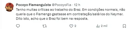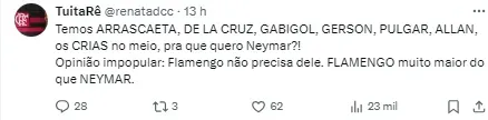 “O Neymar sempre será bem-vindo aqui no Flamengo, por razões óbvias. Mas na minha cabeça é uma contratação, hoje, impossível. Vários pontos botam questionamento em uma contratação como essa, até pelo atual contrato dele”, comentou.