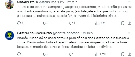 Com a situação, Marinho ainda fez questão de citar o torcedor santista: “Torcedor pode ficar chateado comigo, mas nunca deixei de demonstrar em campo. Sempre me dediquei. Os números estão aí“.