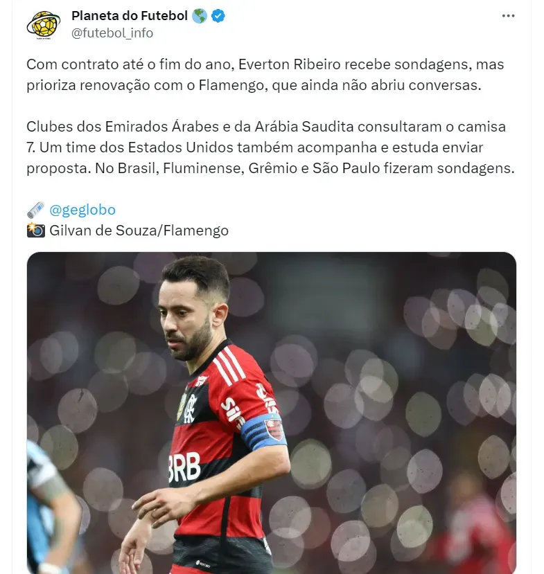 No entanto, conforme a mesma fonte, o Flamengo ainda não iniciou conversações para renovar o contrato com o jogador. Everton Ribeiro faz parte de um grande grupo de atletas cujos contratos estão chegando ao fim.