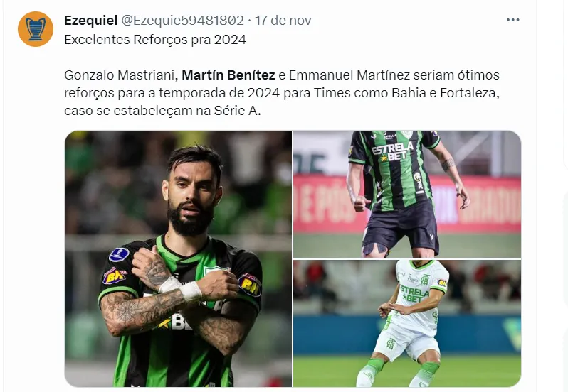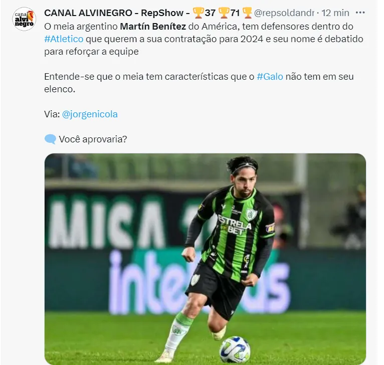 “O nome do meia argentino, que pertence ao América, é debatido internamente no Atlético. Quero dizer mais: Benítez tem alguns defensores dentro do Galo, que entendem que ele seria um bom nome para o elenco“, disse Nicola.