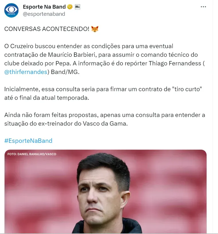 Maurício Barbieri e o Cruzeiro estão em negociações para um possível acordo que poderia se estender até o final da temporada brasileira. O clube mineiro, que demitiu Pepa, está procurando obter uma compreensão mais clara das ideias do ex-técnico do Vasco. Essa informação foi divulgada por Thiago Fernandes.