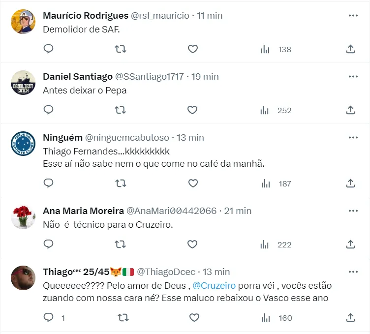 Além de Barbieri, outros nomes também estão sendo considerados pelo Cruzeiro. A intenção da equipe da Raposa é contratar uma espécie de treinador temporário para o restante da temporada, o que complica um pouco as coisas neste momento. Nas redes sociais, a torcida do Cruzeiro parece não estar muito favorável à possível chegada desse novo treinador.