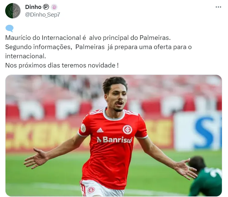 Isso porque, de acordo com Jorge Nicola, o Palmeiras é o mais novo interessado em contar com o futebol de Maurício, do Internacional, para 2024, e pode atrapalhar os planos do rival em busca de fechar com o jovem jogador.