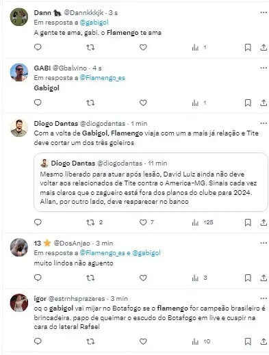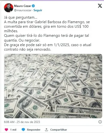 “Já que perguntam… A multa para tirar Gabriel Barbosa do Flamengo, se convertida em dólares, gira em torno dos US$ 100 milhões. Quem quiser tirá-lo do Flamengo terá de pagar tal quantia. Ou negociar. De graça ele pode sair só em 1/1/2025, caso o atual contrato não seja renovado.“, informou Mauro Cezar.