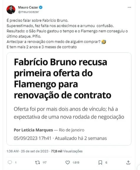 Em suas redes sociais, Mauro Cezar insinuou que o zagueiro Fabrício Bruno estaria sendo supervalorizado. A polêmica surgiu após a notícia de que o jogador teria recusado a primeira proposta de renovação de contrato com o Flamengo, oferecendo dois anos adicionais de vínculo. O jornalista destacou essa recusa e apontou que o jogador estaria sendo valorizado além do que deveria.