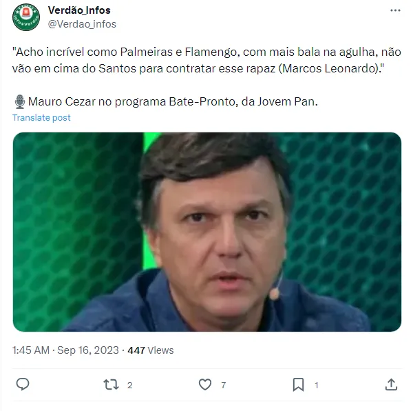 “Acho incrível como Palmeiras e Flamengo, com mais bala na agulha, não vão em cima do Santos para contratar esse rapaz. (Flamengo) tentou o Ângelo, tinha que tentar o Marcos Leonardo antes dele ir para a Europa. O Santos precisa de dinheiro e vai precisar mais ainda. Em um time bom ele vai fazer mais estrago ainda.”, comentou Mauro Cezar.