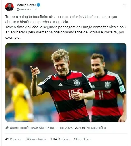 “Tratar a seleção brasileira atual como a pior já vista é o mesmo que chutar a história ou perder a memória. Teve o time do Leão, a segunda passagem de Dunga como técnico e os 7 a 1 aplicados pela Alemanha nos comandados de Scolari e Parreira, por exemplo”, disse Mauro Cezar.