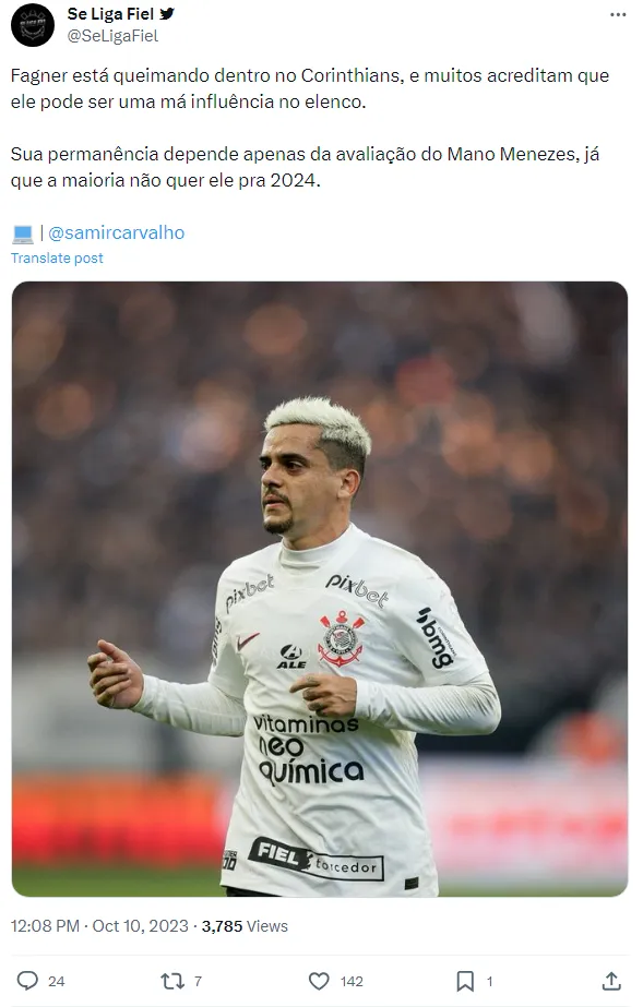 De acordo com informações do jornalista Samir Carvalho, o Corinthians está considerando a possibilidade de liberar o jogador, visto que ele não está sendo bem recebido dentro do clube, principalmente devido a preocupações com sua influência negativa no ambiente. Vale lembrar que Fagner tem contrato até dezembro de 2024.