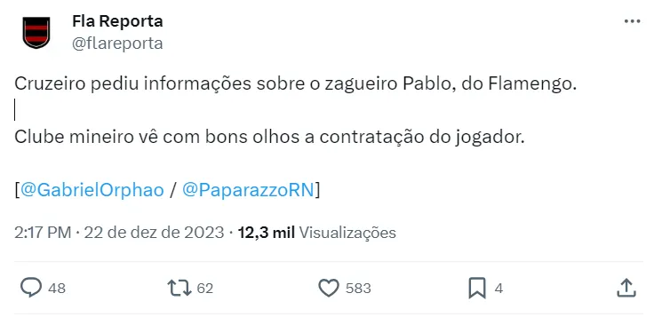 Ainda de acordo com a fonte, o Cruzeiro vê com bons olhos a possível chegada de Pablo em 2024, que encontra-se sem espaço com o técnico Tite e pode deixar o Flamengo.