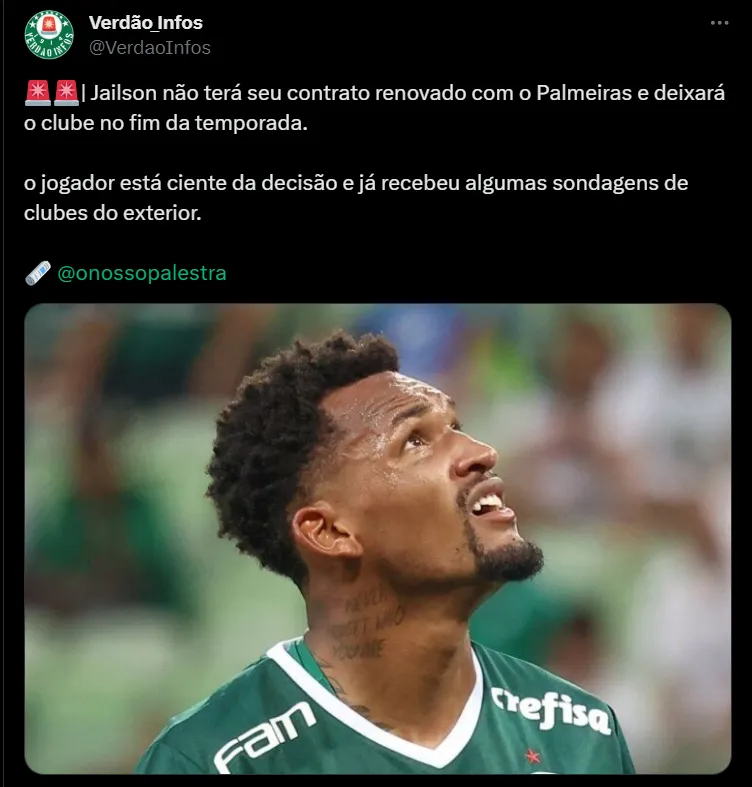 De acordo com as informações publicadas pelo portal “Nosso Palestra”, o Palmeiras não irá renovar o contrato com o volante Jailson. O vínculo do atleta vai até o fim desse ano.