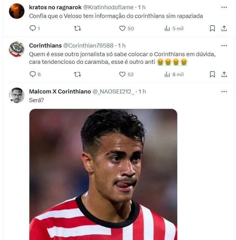 Nas redes socias, em meio a informação de Velloso, a torcida do Timão tenta descobrir quem seria esse tal jogador que estaria em conversas avançadas para jogar no Corinthians.