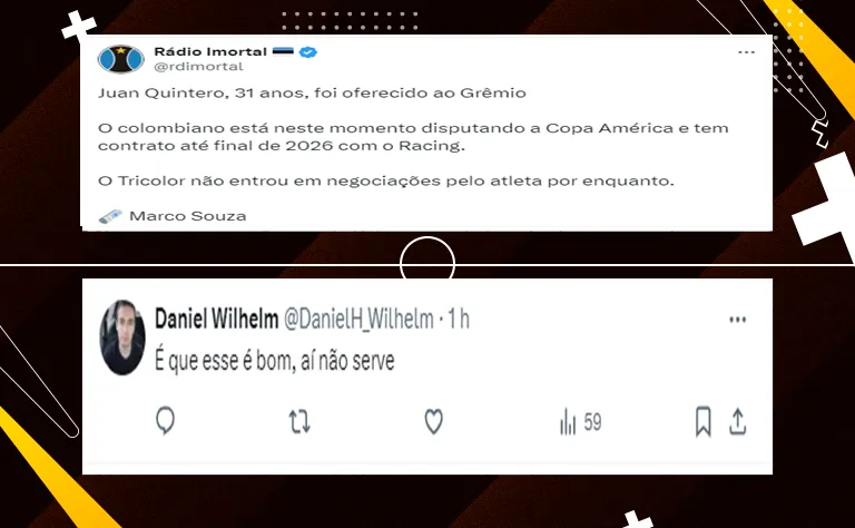 Isso porque, de acordo com Marco Souza, Juan Quintero teria sido oferecido ao Grêmio. Camisa 10 clássico e nome muito conhecido, o meia tem contrato com o Racing até o fim de 2026.