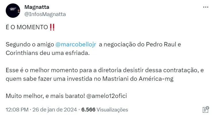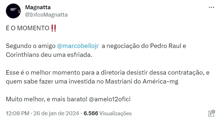 Nas redes sociais, parte da torcida do Corinthians pede que o clube tente ao menos entender melhor sobre a situação de Mastriani com as cores do América-MG.