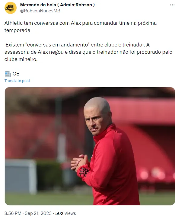 Atualmente sem um clube para comandar, Alex pode estar próximo de assumir o comando do Athletic, equipe mineira que tem se tornado uma presença interessante no cenário esportivo. De acordo com o GE, o clube já está em conversas avançadas com o ex-técnico do Avaí.