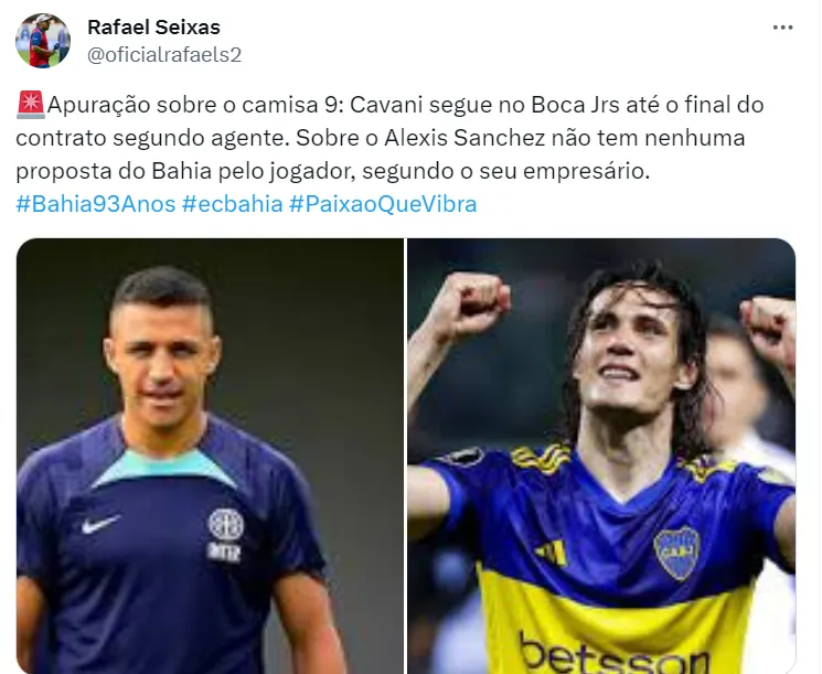 Outro nome que vem sendo especulado como possível reforço do Bahia é Cavani, do Boca Juniors. Todavia, a chance de acordo é quase nula, uma vez que ele tem contrato a cumprir.