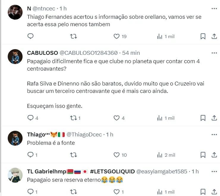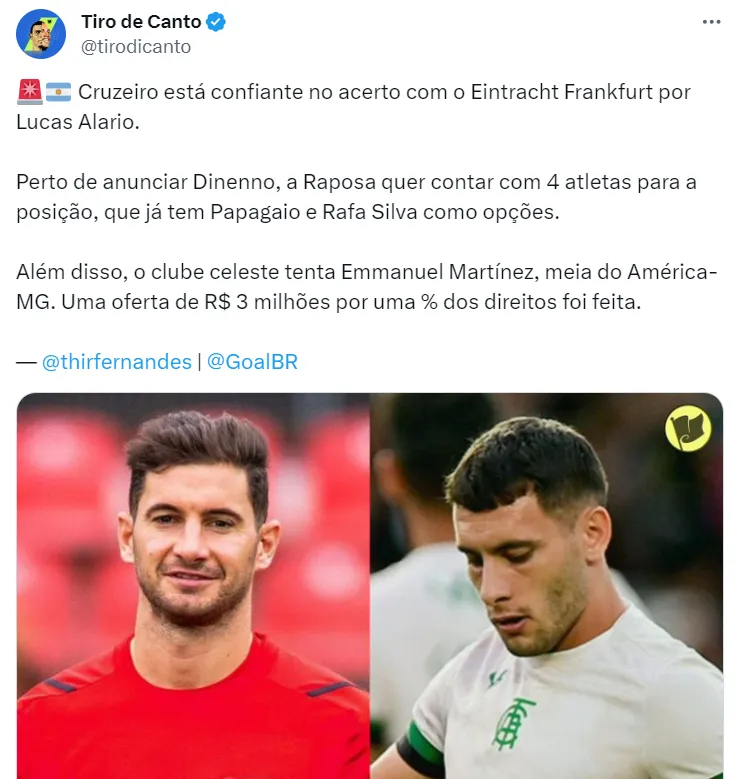 Além de Lucas, o Cruzeiro teria apresentado uma oferta de 3 milhões de euros Martínez, do América-MG, que ainda não respondeu a investida da Raposa. A Raposa encontra-se focada no mercado.