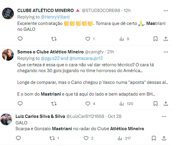 O nome de Mastriani é um dos jogadores que o clube está monitorando para trazer no próximo ano, de acordo com informações de Marco Geves, do Canal Bica Galo.