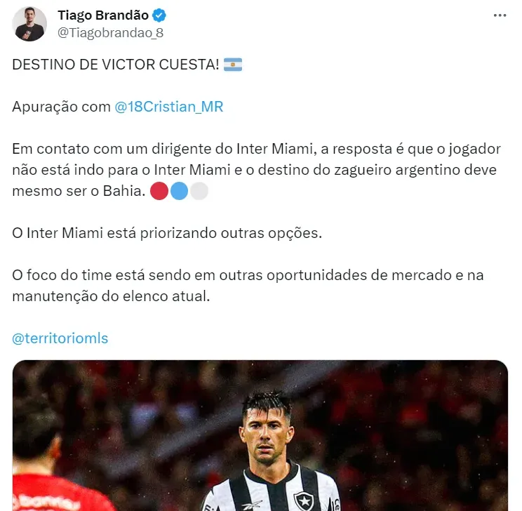 O Bahia fica próximo de Victor Cuesta em meio ao fato da Inter de Miami ter outros planos no mercado da bola. A fonte informa que entrou em contato com o clube americano e ouviu que o destino do defensor deve ser o time de Ceni.