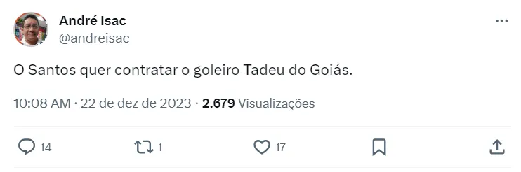 Também rebaixado, o Santos se interessa por Tadeu e, de acordo com André Isac, deseja a contratação do goleiro para 2024. O Peixe busca se reforçar no mercado para a uma intensa disputa de Série B.